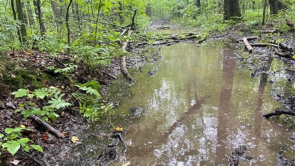 I continued to pick up a bit of lost time from moving slower through Segment A and navigated the course at a pace I felt comfortable with, moving up a few positions. But just as I was getting comfortable, the rain began. All week, the forecast was perfect, but two days before the race the forecast had started to turn. Now a chance of rain persisted throughout the entire weekend. This was the beginning of what would be dubbed Mudwest States. To make matters worse, the low-lying ground and abundance of existing water offered no drainage paths for the rain. Water simply began to pool on the trail, and the small streams widened. I took care to try and navigate around the water and keep my feet dry. The trails were getting wet, but they were still manageable with a little bit of extra care and time. These conditions were a big contrast to what runners would encounter later in the race. I soldiered on through the rain and continued to make good time as I came into Aid Station 2. Again, I checked in with Emma, rehydrated, grabbed a Clif Bar, and started on the next segment.
